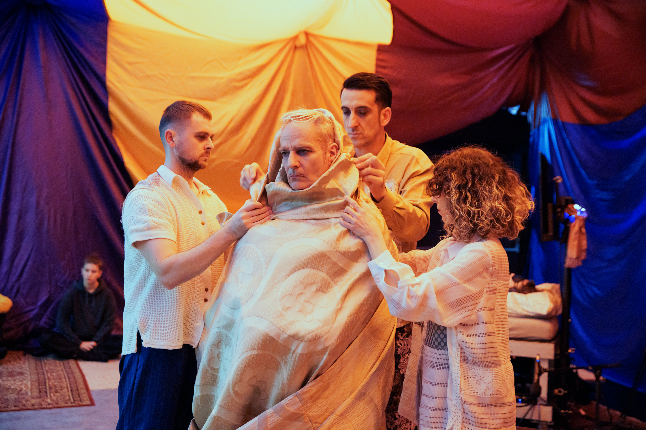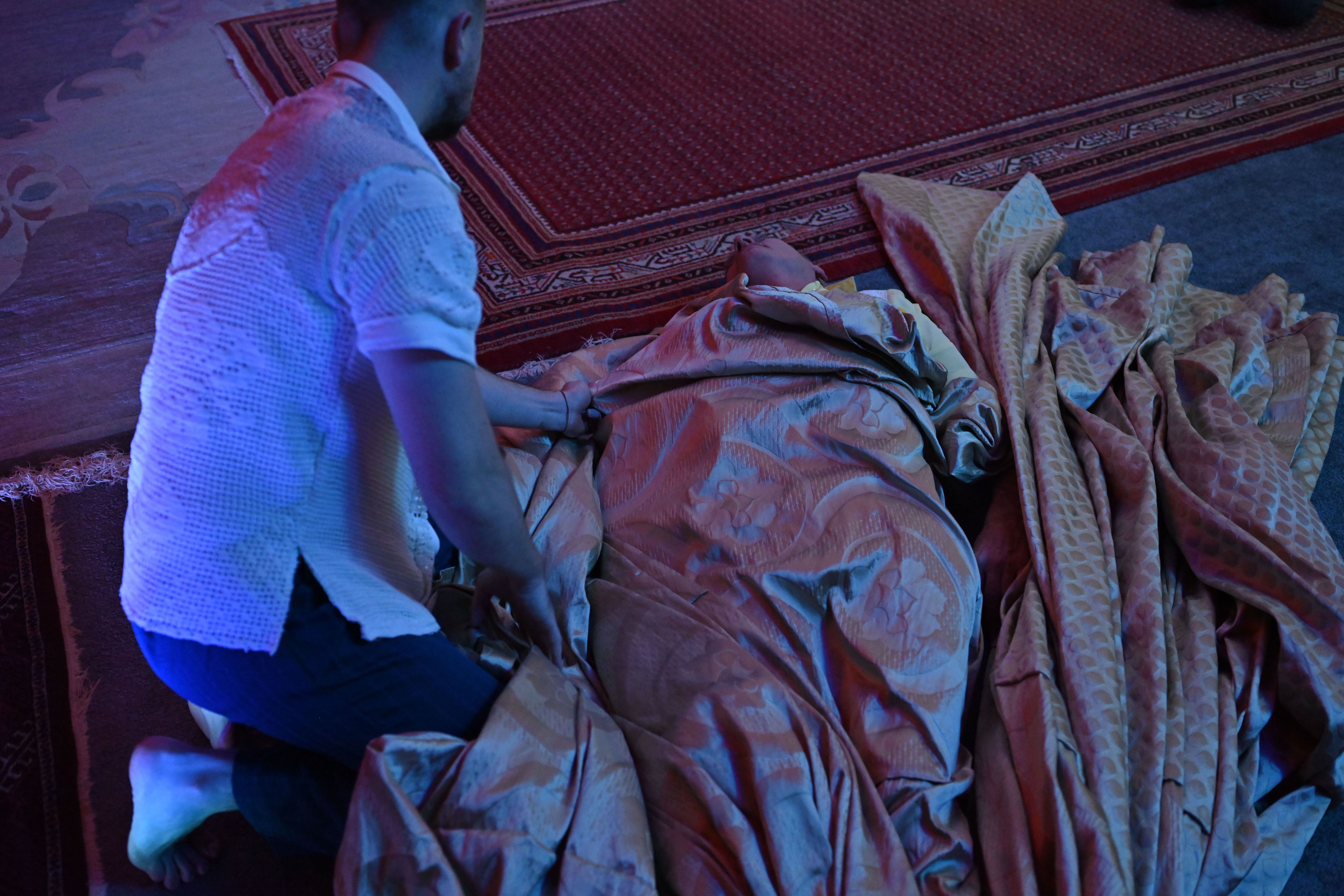 Das Tuch ist ein Zitat aus dem Stück „The Top Five Letters of Liaisons Dangereuses“ von Showcase Beat Le Mot (2024).
